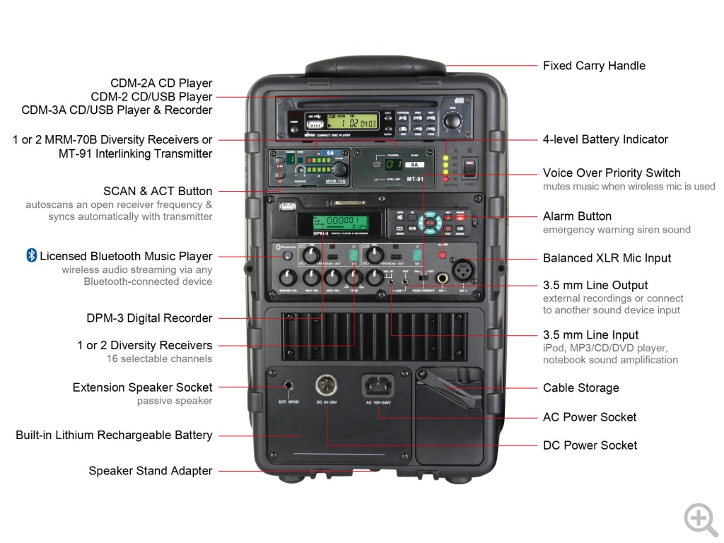 - Industry’s only MT-91 wireless interlinking transmitter option to interlink multiple MA-505 portables wirelessly